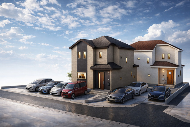 〈オール電化住宅〉 駐車3台可!前面道路も広く車も停めやすい! A号棟:玄関吹抜、SIC、ランドリースペース、WIC B号棟:ランドリースペース、フリーコーナー、WIC