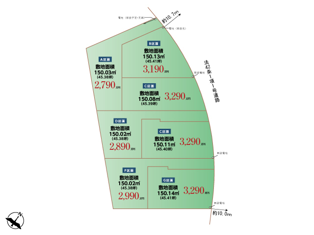 - A区画 北東:10.5m B区画 北東:10.5m C区画 北東:12.03m D区画 北東:11.98m E区画 北東:11.77m F区画 北東:11.06m G区画 北東:10.01m
