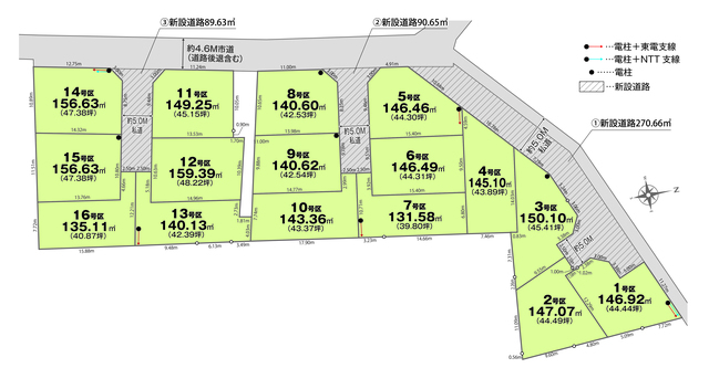 - 1区画 西:5m 2区画 北:5m 3区画 北:5m 4区画 西:5m 5区画 西:4.6m 南:5m